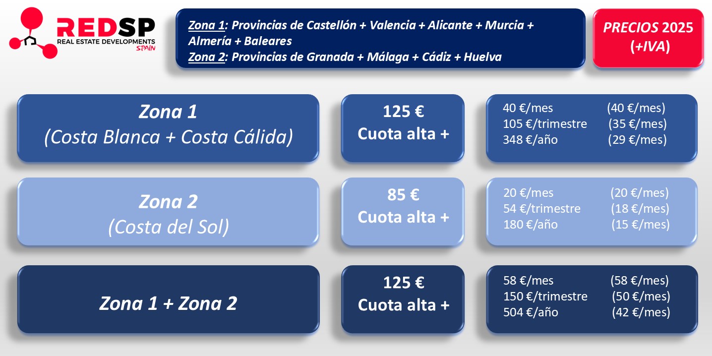 Puedes contratar la Zona 1 (Costa Blanca + Costa Cálida), la Zona 2 (Costa del Sol) o ambas (Zona 1 + Zona 2):
